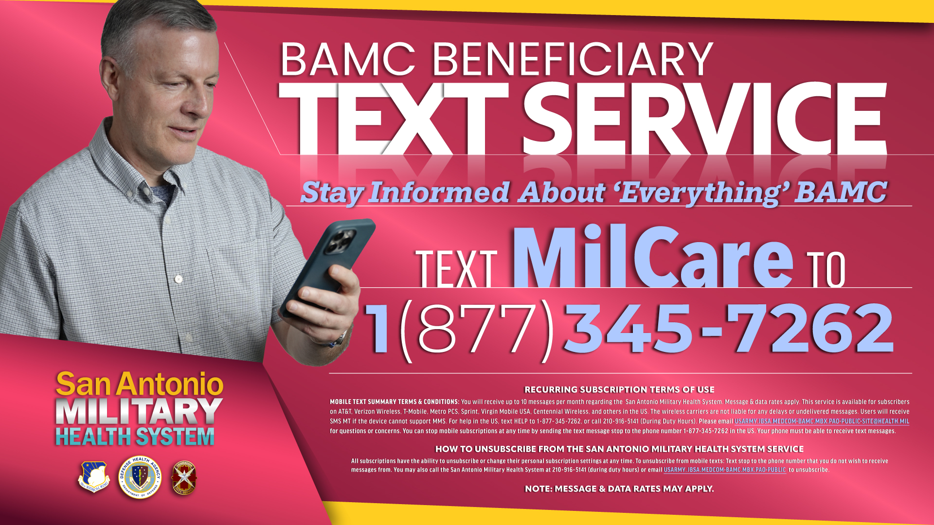 All subscribers have the ability to unsubscribe or change their personal subscription settings at any time. To unsubscribe from Mobile Texts: Text STOP to the phone number that you do not wish to receive messages from. You may also call the San Antonio Military Health System at 210-916-5118 (during duty hours) or email usarmy.jbsa.medcom-bamc.mbx.pao-public-site@health.mil to unsubscribe.
